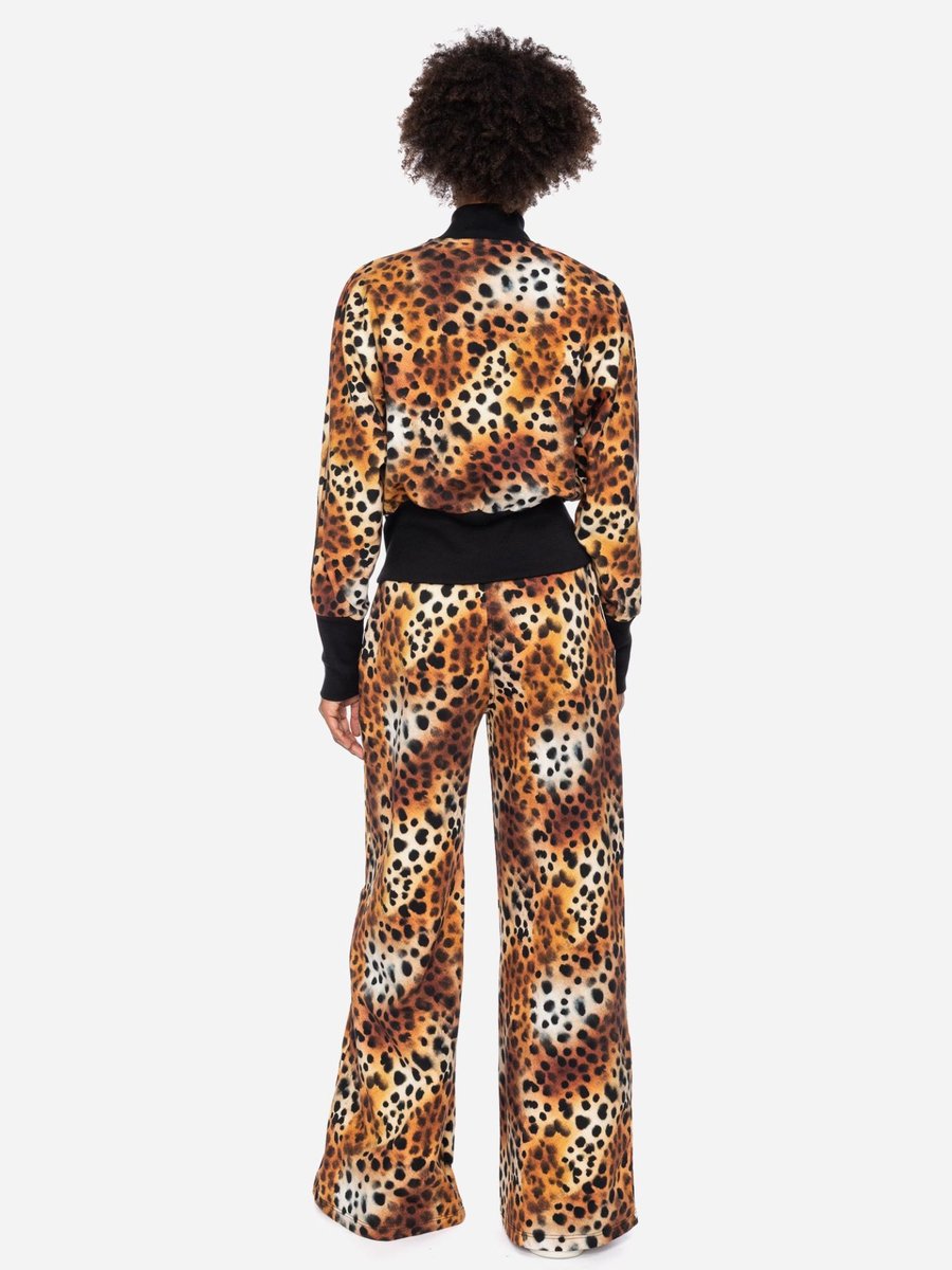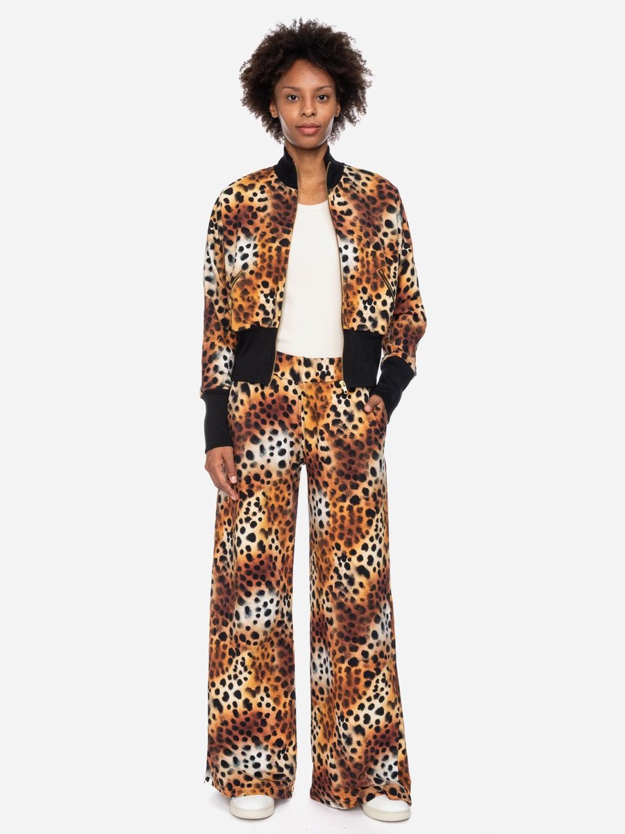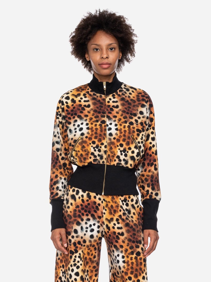 Die kurze Jacke Fleder verbindet auffälligen Animal Print mit sportlicher Lässigkeit. Der hohe Kragen und die breiten Rippsäume in tiefem Schwarz sorgen für markante Kontraste und geben der Jacke ihre charakteristische Silhouette.