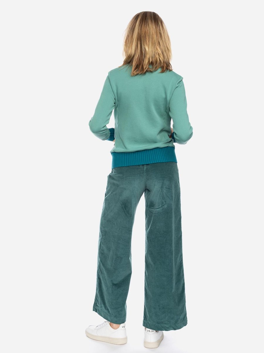 Die weiche Sweatqualität aus 100 % GOTS-zertifizierter Bio-Baumwolle fühlt sich angenehm auf der Haut an. Strickbündchen in dunklem Türkis und der hohe Kragen mit Strickfutter innen runden das Design funktional und stilvoll ab. Produziert unter fairen Bedingungen in Portugal – für ein gutes Gefühl beim Tragen.
