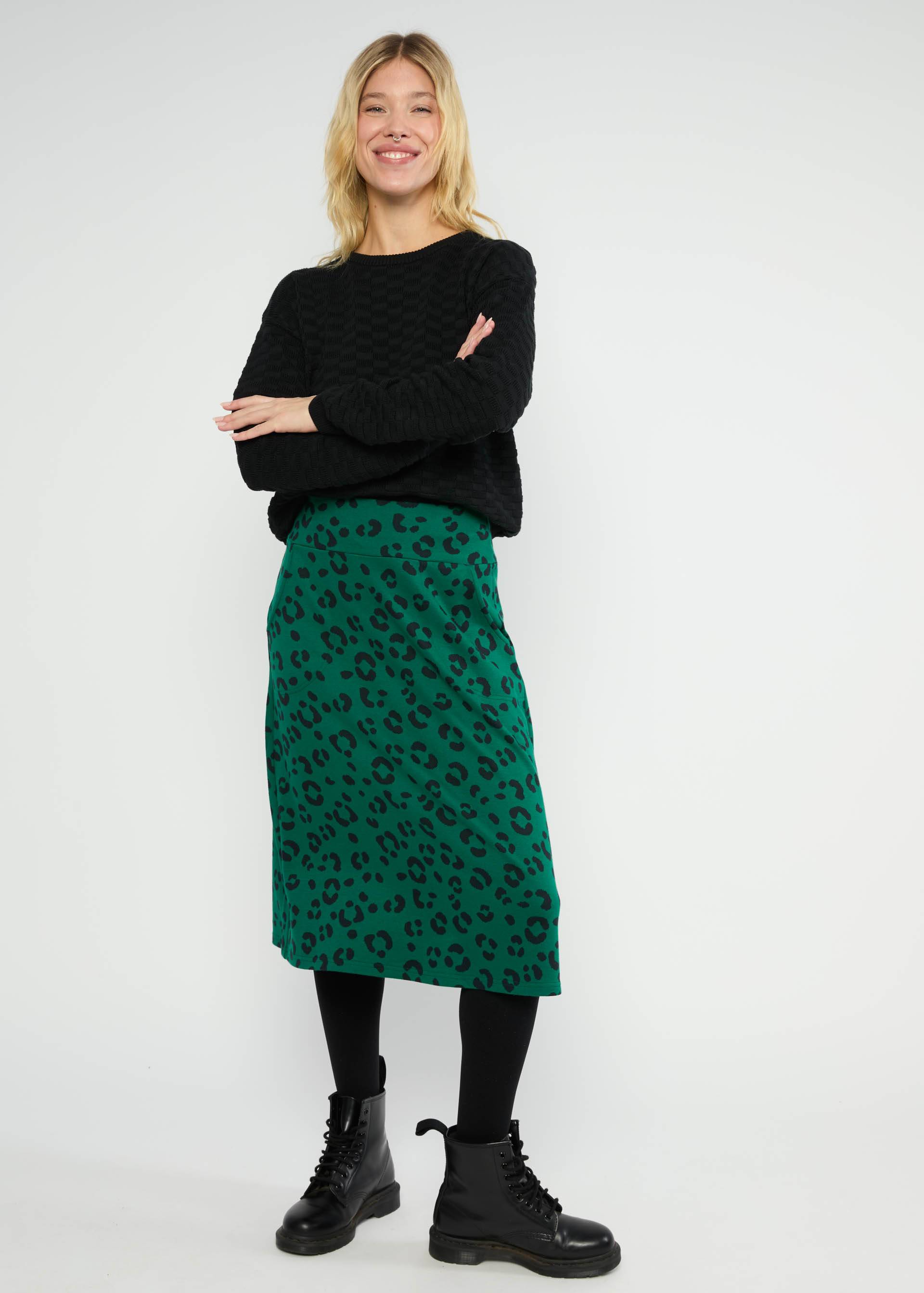 Dieser wadenlange Midirock aus anschmiegsamem Bio-Baumwoll-Interlock mit 5 % Elasthan bietet sanften Halt, wärmt angenehm und bleibt zuverlässig in Form.