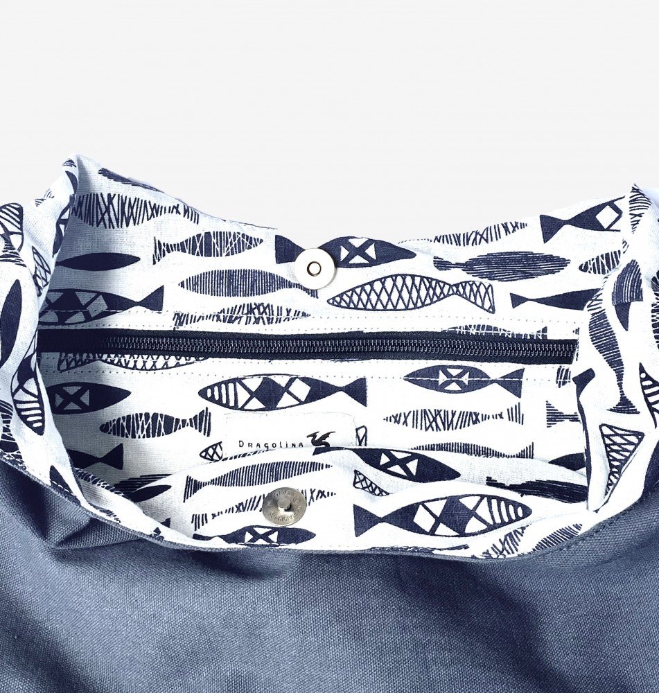 Das Hauptfach ist durch einen Druckknopf verschließbar. Im Inneren hat die Tasche ein geräumiges Reißverschlussfach um z.B. Wertsachen zu verstauen.
