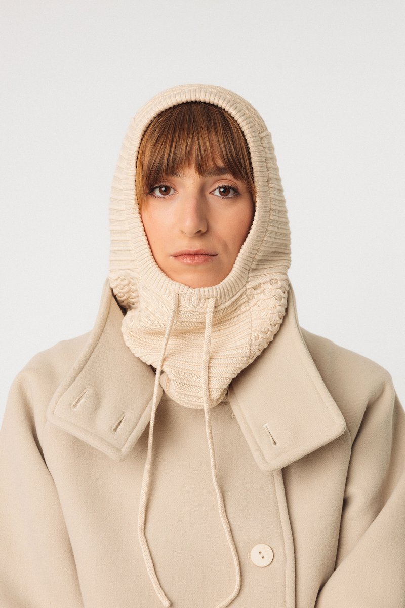 Naturmode von SKFK Trendige Schlupfmütze aus Bio-Baumwolle in winterlichem Cream. Das raffinierte Strickmuster und sas Bindeband (Tunnelzug am Gesichts-Ausschnitt) machen diese Schlupfmütze zum absoluten Must-Have.