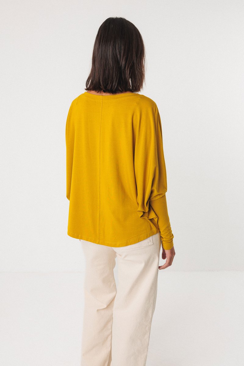 Schickes Blusenshirt von SKFK. Das Shirt aus weich fließendem Tencel ist weit geschnitten. Die Besonderheit sind die Fledermaus-Ärmel mit den eng anliegenden Unteramen.