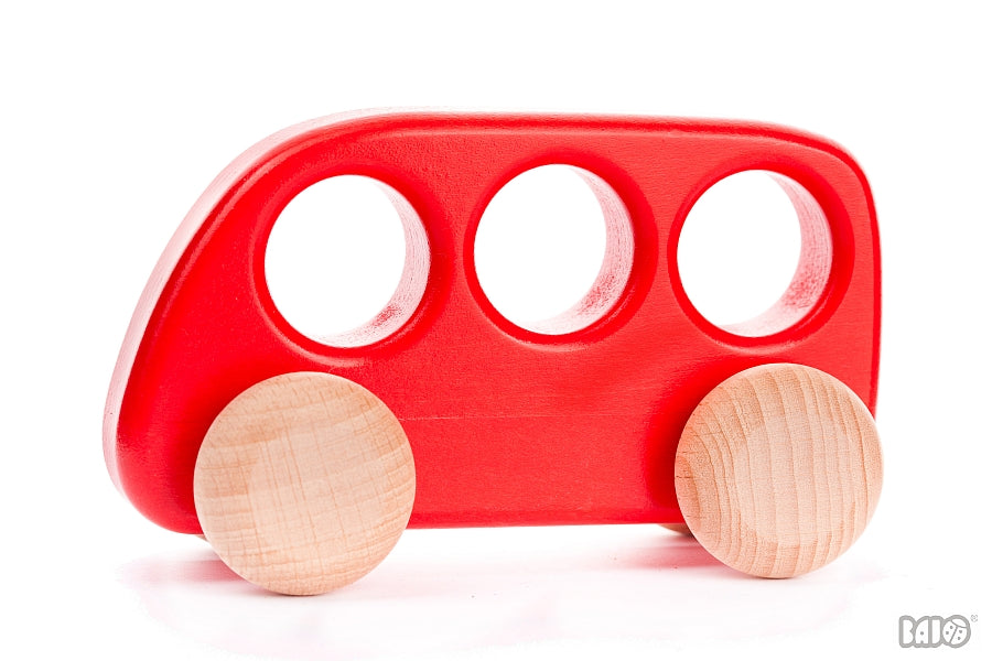 Der Bajo Bus in leuchtendem Rot ist ein wunderschönes Holzspielzeug aus Polen, das kleine Entdecker ab dem Greifling-Alter begeistert.